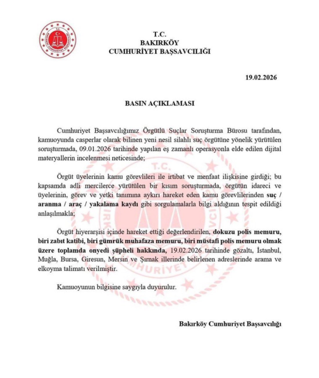 Bakırköy Cumhuriyet Başsavcılığı'ndan yapılan açıklama şu şekilde: "Cumhuriyet Başsavcılığımız Örgütlü Suçlar Soruşturma Bürosu tarafından, kamuoyunda casperlar olarak bilinen yeni nesil silahlı suç örgütüne yönelik yürütülen soruşturmada, 09.01.2026 tarihinde yapılan eş zamanlı operasyonla elde edilen dijital materyallerin incelenmesi neticesinde;