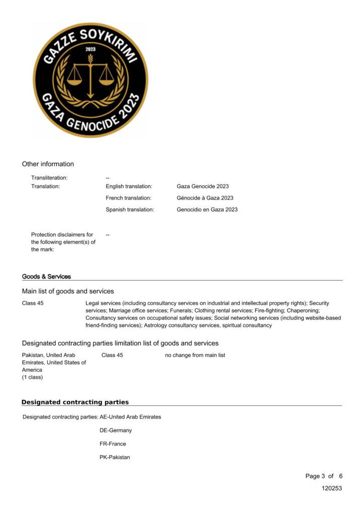 “Biz, çok uluslu Türk milletleri olarak toplumun bütün kesimlerinin tepkisine neden olan bu insanlık ayıbının karşısında ne denli dirayetli durduğumuzu gösteren; hukukun üstünde, uluslararası antlaşmalarla kurulan Türk Patent Enstitüsü’ne ve Dünya Fikri Mülkiyet Örgütü’ne (WIPO - World Intellectual Property Organization) sunulan bu belgelerle, dünyanın bu ayıbına ortak olmadığımızı resmen ilan ediyor; belgeleri Türk ve dünya kamuoyuyla paylaşıyoruz.” dedi.