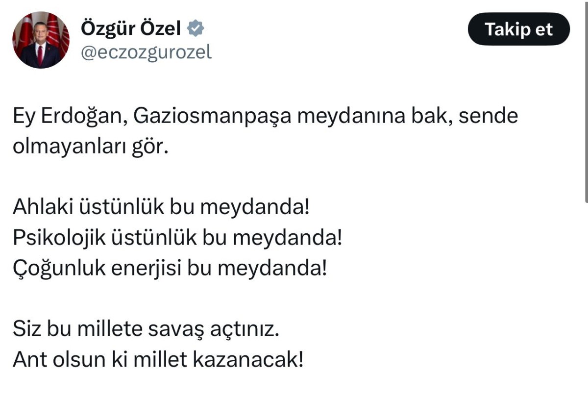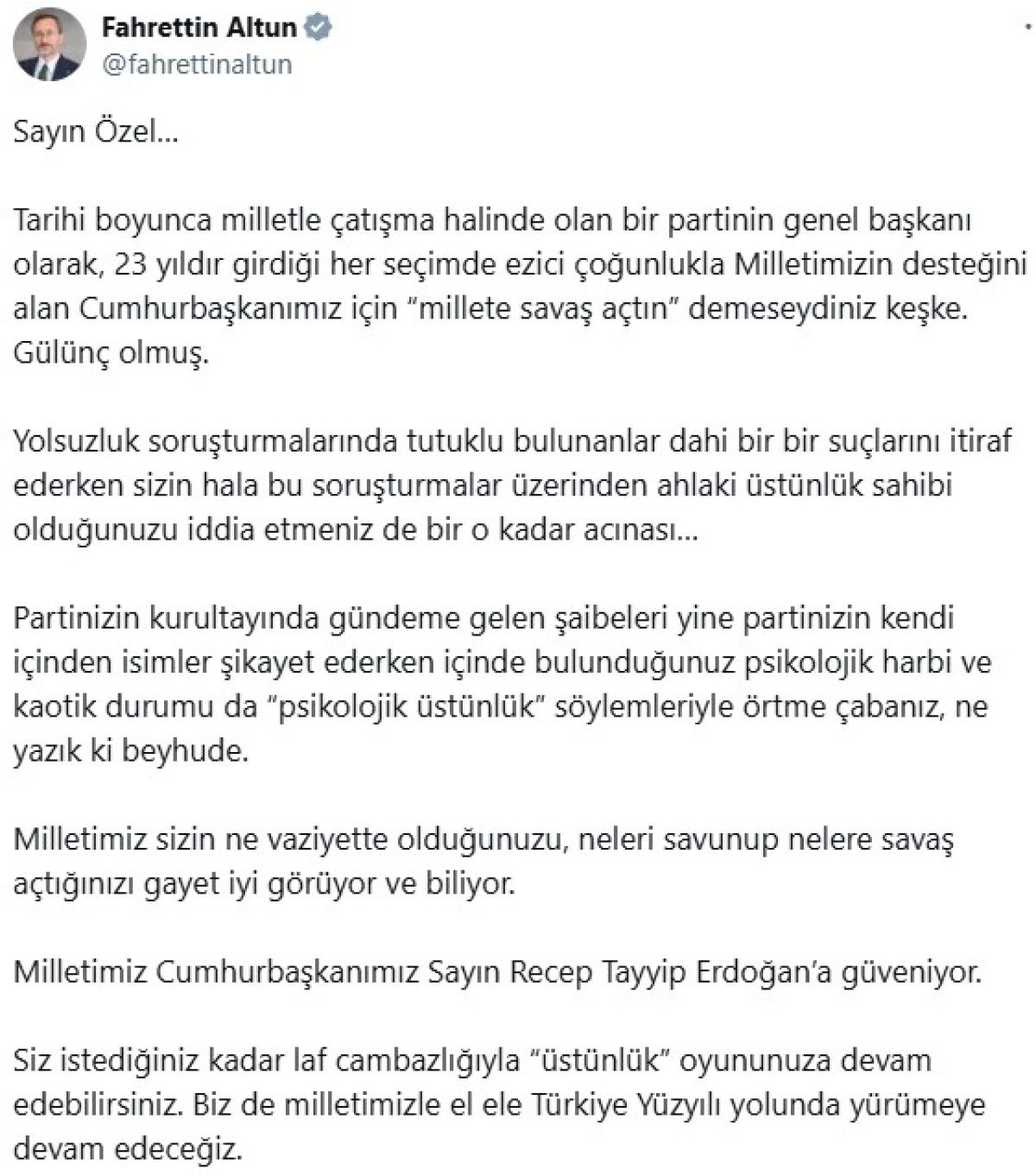 Fahrettin Altun, "Sayın Özel… Tarihi boyunca milletle çatışma halinde olan bir partinin genel başkanı olarak, 23 yıldır girdiği her seçimde ezici çoğunlukla milletimizin desteğini alan Cumhurbaşkanımız için 'millete savaş açtın' demeseydiniz keşke. Gülünç olmuş." değerlendirmesinde bulundu.