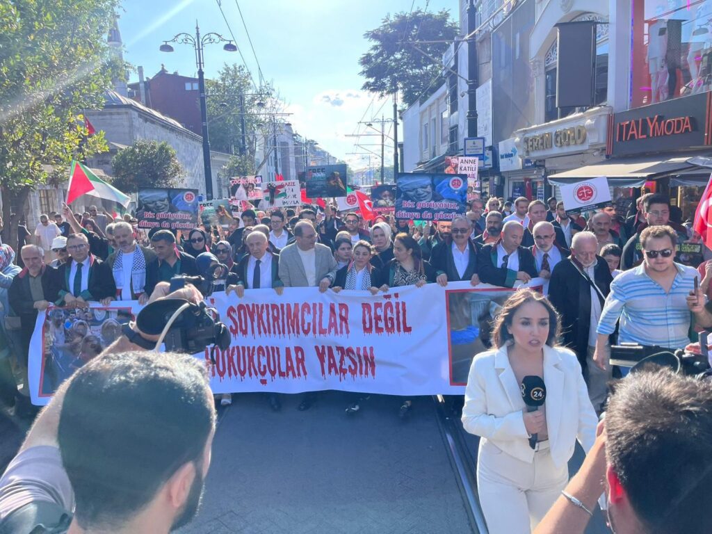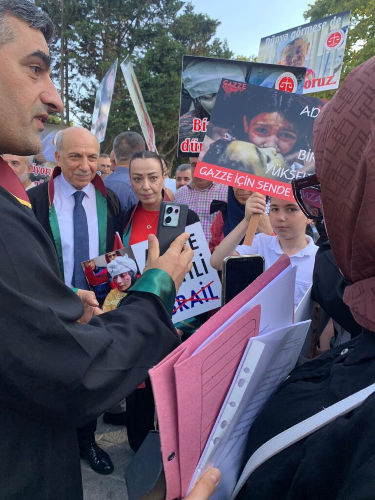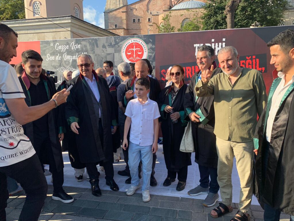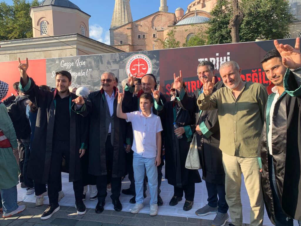Beyazıt Meydanı'nda toplanan hukukçular, cübbelerini giyerek, "Kahrolsun soykırımcılar, yaşasın çocuklar", "Tarihi soykırımcılar değil hukukçular yazsın", "Anne katili İsrail", Biz görüyoruz dünya da görsün" yazılı pankart ve dövizler taşıdı, "Katil İsrail Filistin'den defol" sloganları attı.
