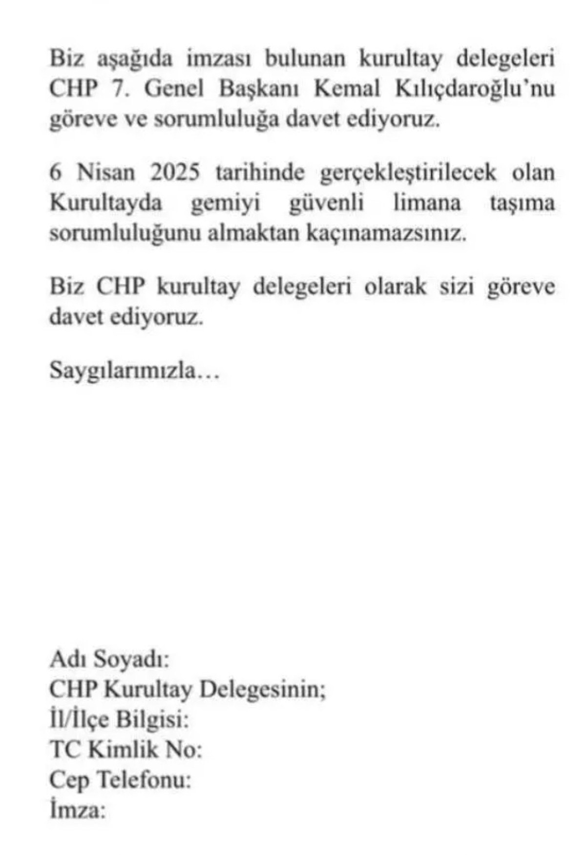 Biz aşağıda imzası bulunan kurultay delegeleri, CHP 7. Genel Başkanı Kemal Kılıçdaroğlu'nu göreve ve sorumluluğa davet ediyoruz.