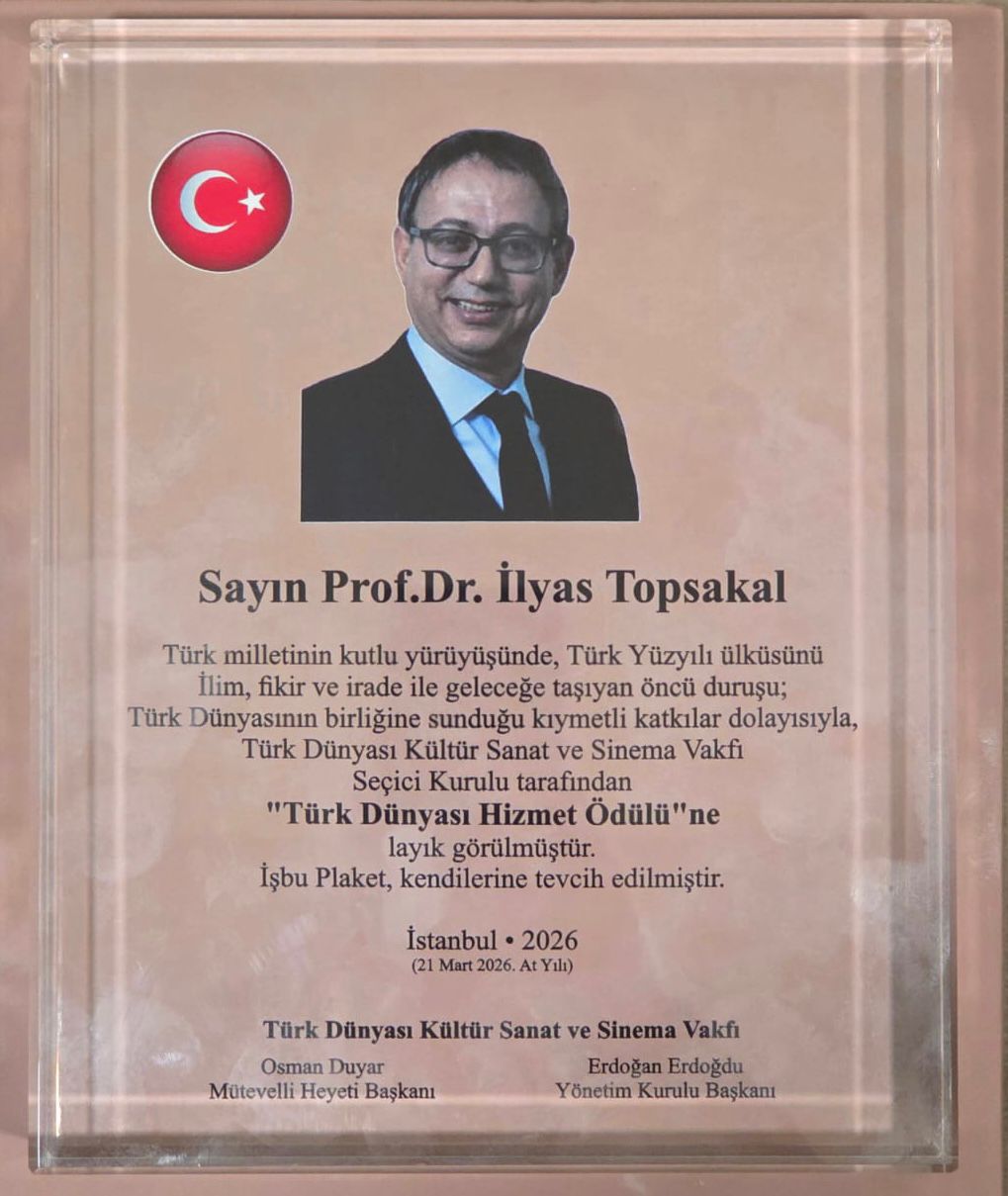 Türk milletinin kadim ülkülerini geleceğe taşıyan, ilmi birikimi ve fikrî derinliğiyle “Türk Yüzyılı” vizyonuna yön veren önemli isimlerden biri olan Prof. Dr. İlyas Topsakal, “Türk Dünyası Hizmet Ödülü”ne layık görüldü.