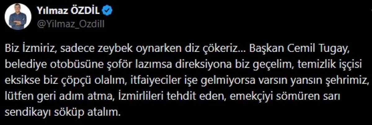 Biz İzmiriz, sadece zeybek oynarken diz çökeriz… Başkan Cemil Tugay, belediye otobüsüne şoför lazımsa direksiyona biz geçelim, temizlik işçisi eksikse biz çöpçü olalım, itfaiyeciler işe gelmiyorsa varsın yansın şehrimiz, lütfen geri adım atma, İzmirlileri tehdit eden, emekçiyi sömüren sarı sendikayı söküp atalım.